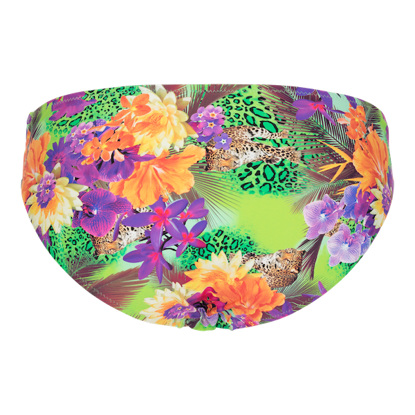 This bikini brief has a twist front with ruched fabric and is fully lined. The jungle print is vibrant, with colours of lime green, purple, orange and a 'tiger'.