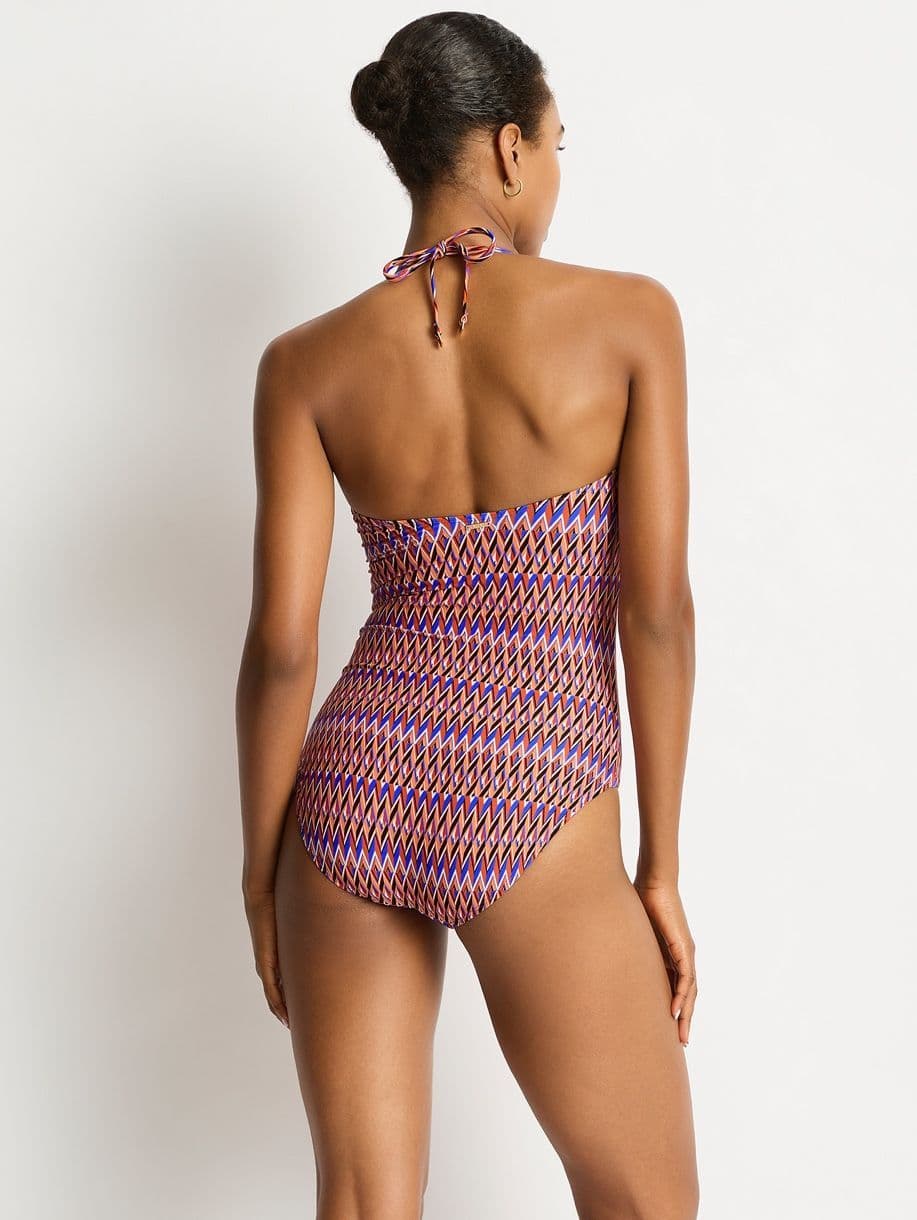 A strapless style swimsuit with u-bar detailing at the centre front. Removable soft cups for shape and support, optional shoulder straps and powermesh lining for support. The Tessera collection features a kaleidoscope of vibrant hues of blue, flame and black interwoven in a geometric print.